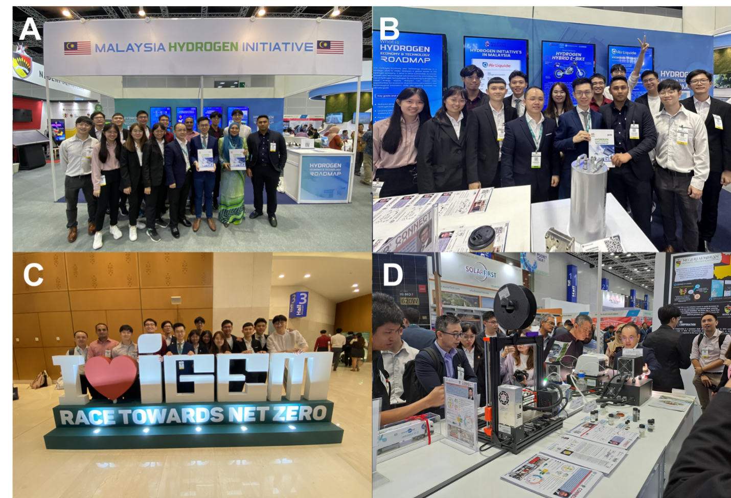 Figure 3. (A-B) Group photos between CONNECT, XMUM and NanoMalaysia Berhad and National Nanotechnology Center with the HETR handbook. (C) Group photo at the IGEM-Race Towards Net Zero outside the exhibition hall. (D) Showcase of CONNECT’s hydrogen product technologies to local and overseas investors, researchers, scientists, educators and public community.