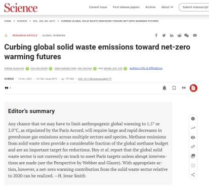 On 17 November 2023, Hoy Zheng Xuan (master student, the first author) and Assoc. Prof. Ts. Dr. Vincent Woon Kok Sin (the corresponding author) from the Department of New Energy Science and Engineering published their paper "Curbing Global Solid Waste Emissions toward Net-zero Warming Futures" in Science and featured in the cover image.