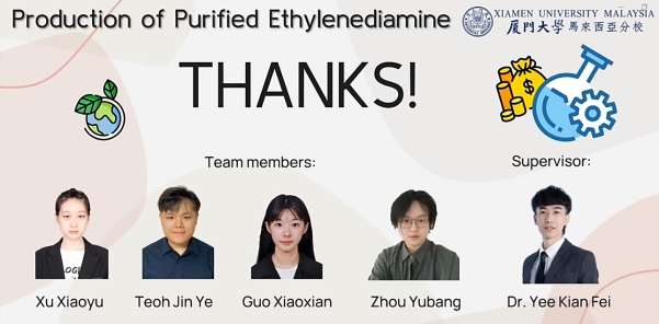 The award-winning short video on Production of Purified Ethylenediamine (EDA) is based on students’ completed CME Capstone Project in their final year study. EDA is an essential precursor to chelation agents, drugs, and agrochemicals. However, due to limited local production and growing global and domestic demand across industries, local EDA plants need to reduce imports and meet rising demand. Hence, the process operating parameters should be optimized to maximize the profit potential and the purification process should be simplified to reduce the overall costs. This video introduced the application of EDA and market outlook, as well as the production process, material of construction, process control and instrumentation applied, previous accident analysis, plant layout, etc.