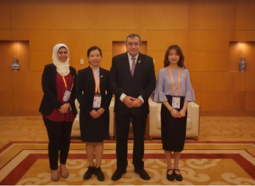(from left to right) Fatma Abdallah, Personal Assistant to Dr. Essam Sharad; Lin Yisheng, Exhibition Staff; Dr. Essam Sharaf, Former Prime Minister of Egypt; Xie Roumei, XMUM volunteer.