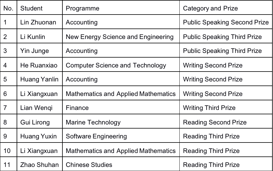 Innovation Center congratulates 10 XMUM students for winning 5 second prizes and 6 third prizes in public speaking, writing, and reading categories of FLTRP Cup English Public Speaking Contest (Xiamen University In-campus Selection Round), after competing with other participants from Xiamen University China.