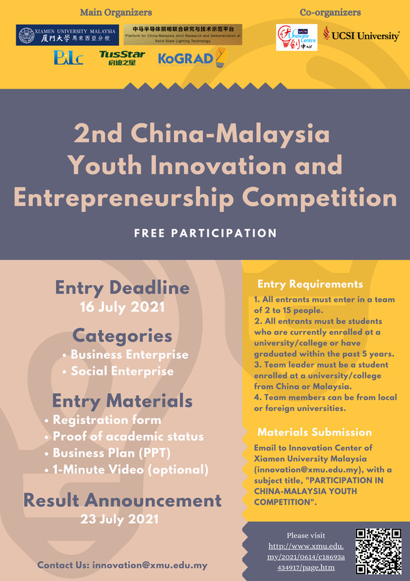 The 2nd China-Malaysia Youth Innovation and Entrepreneurship Competition (hereinafter referred to as the Competition), is initiated by the Promotion Association for Global Youth Innovation Leaders Community (PILC) and organized by Xiamen University Malaysia, Platform for China-Malaysia Joint Research and Demonstration of Solid State Lighting Technology, TusStar Malaysia, and Koperasi Graduan Muda Kebangsaan Berhad (KoGRAD), and co-organized by Universiti Tunku Abdul Rahman (UTAR) and UCSI University. The 1st China-Malaysia Youth Innovation and Entrepreneurship Competition was held in 2019 and has been authorized to serve as the regional preliminary round for the international track of the 5th China College Students’ “Internet+” Innovation and Entrepreneurship Competition (2019) organized by the Ministry of Education of the People’s Republic of China.
