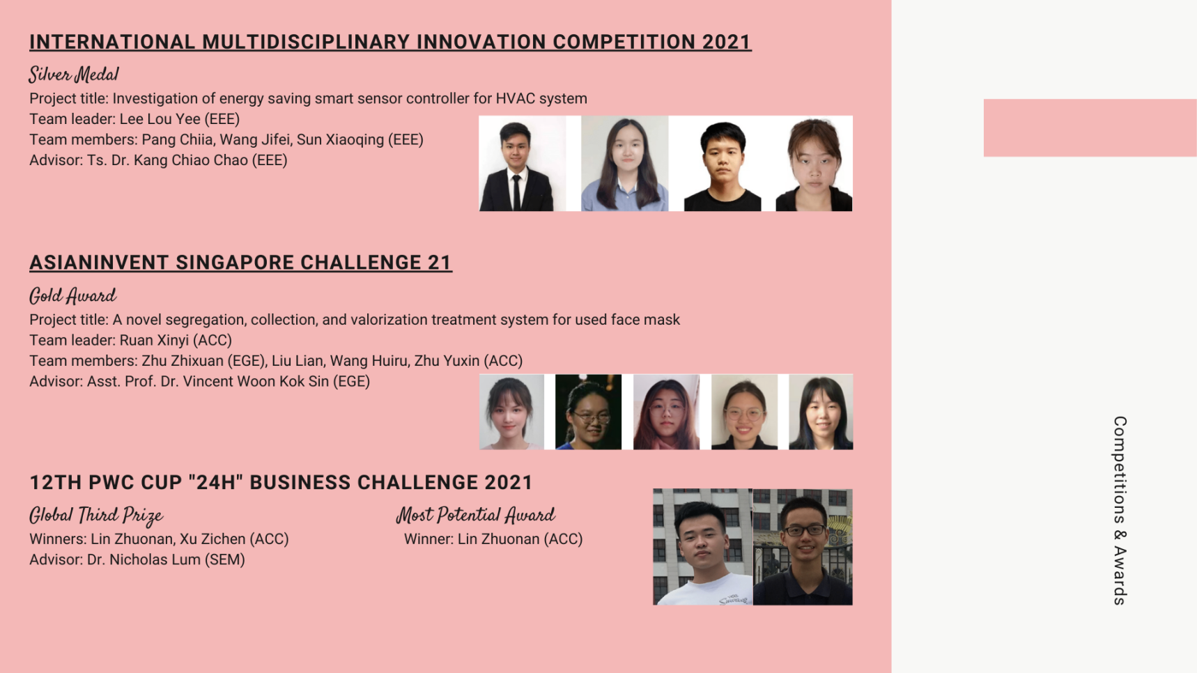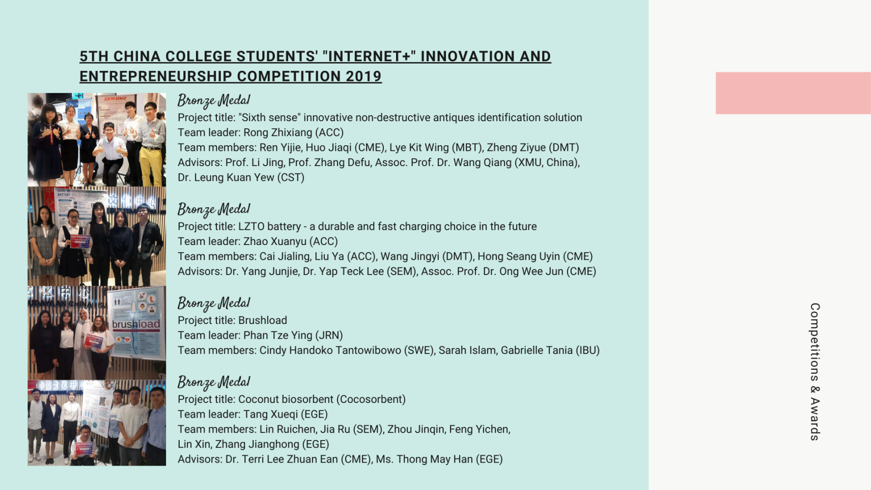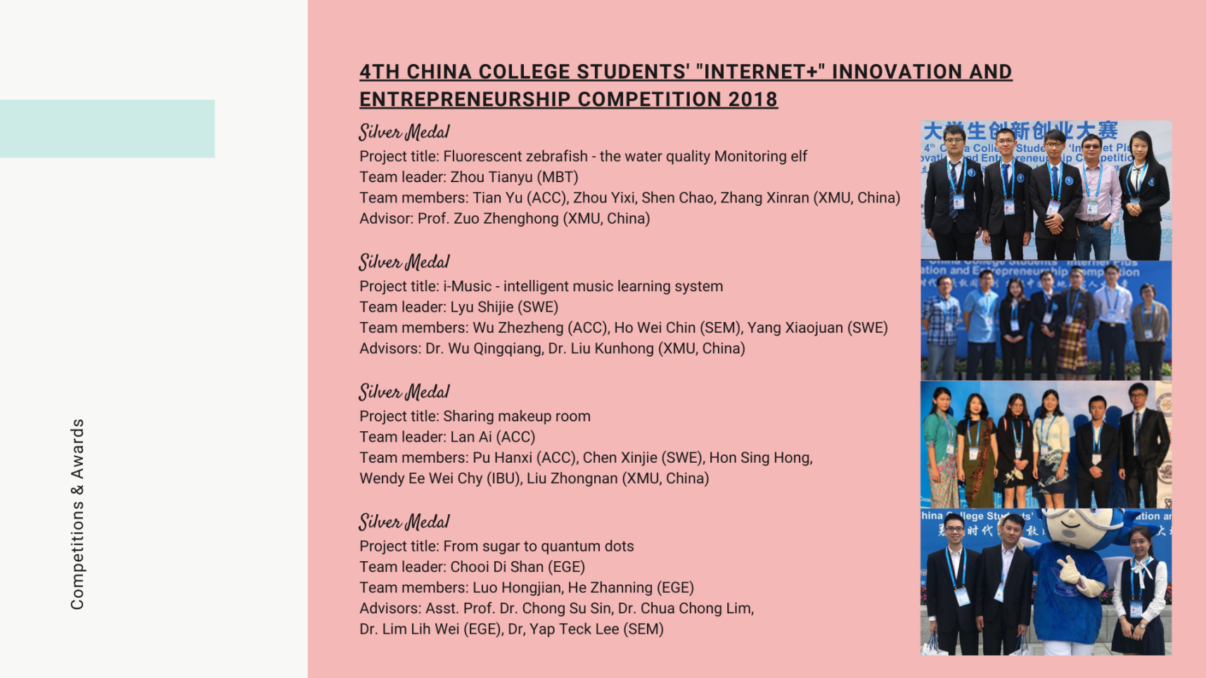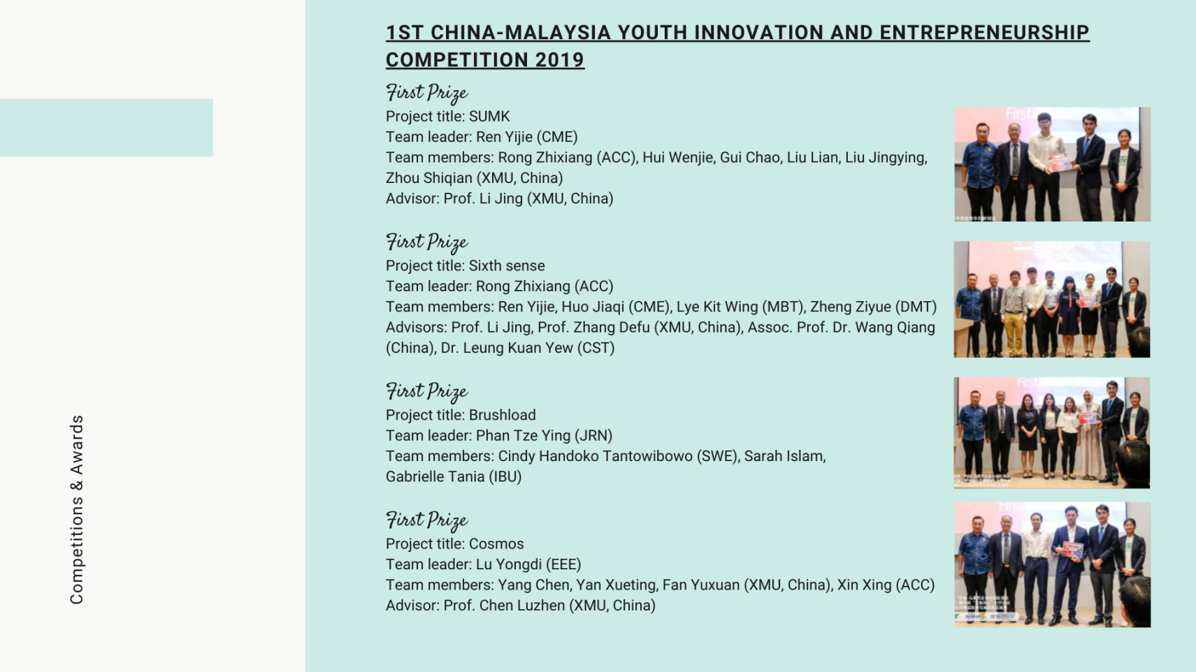 As innovation and creativity are fundamental to all academic disciplines and educational activities, Xiamen University Malaysia (XMUM) encourages students to participate in competitions and values their creative and innovative contributions. Since 2016, XMUM students have participated in more than 20 local, regional and international competitions, and have taken home over 55 prizes and awards marking individual and team success.