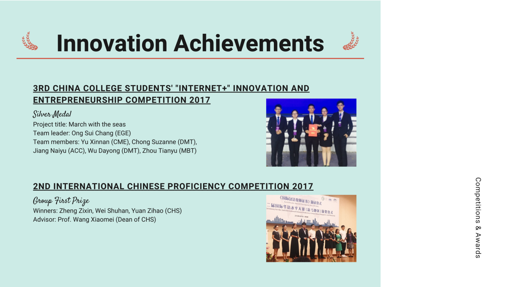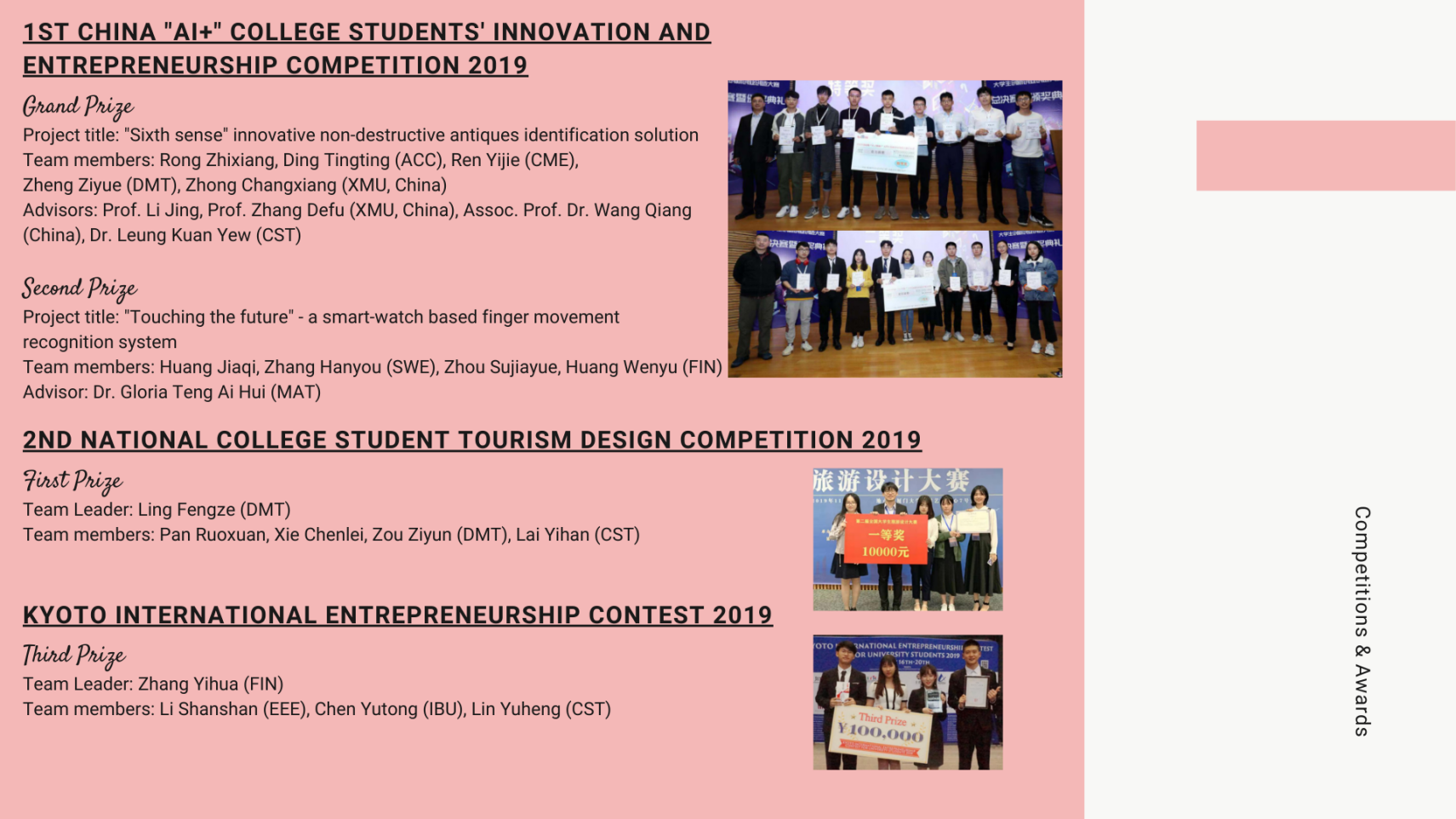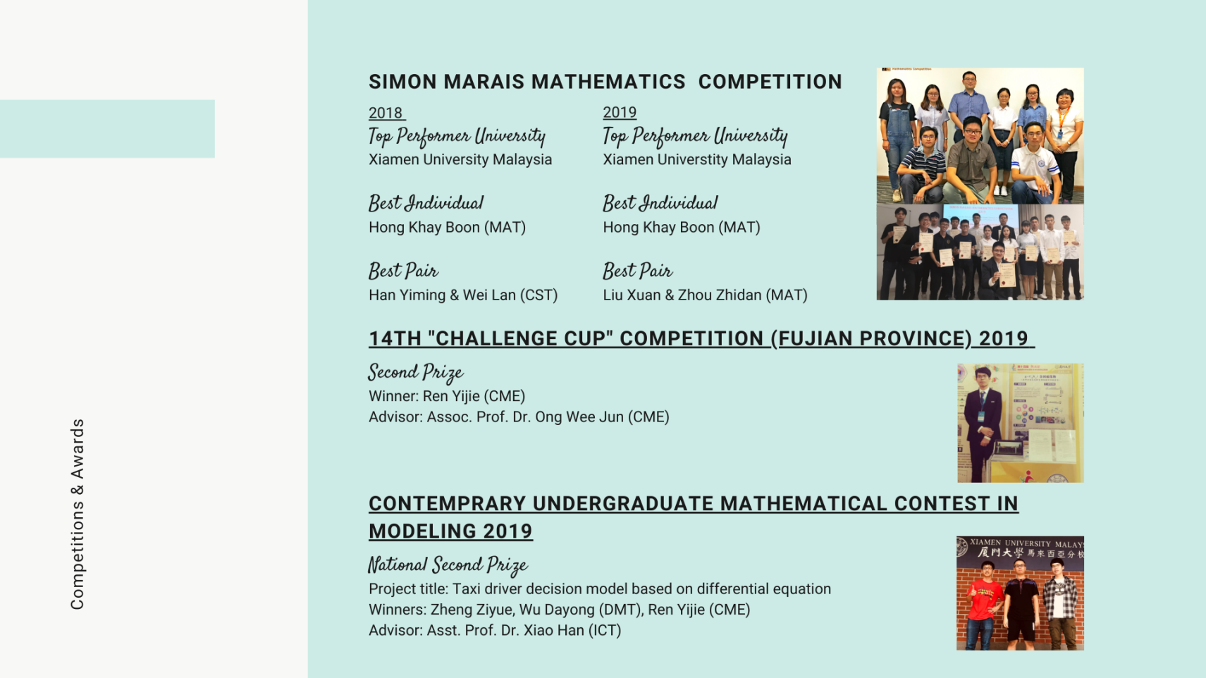As innovation and creativity are fundamental to all academic disciplines and educational activities, Xiamen University Malaysia (XMUM) encourages students to participate in competitions and values their creative and innovative contributions. Since 2016, XMUM students have participated in more than 20 local, regional and international competitions, and have taken home over 55 prizes and awards marking individual and team success.