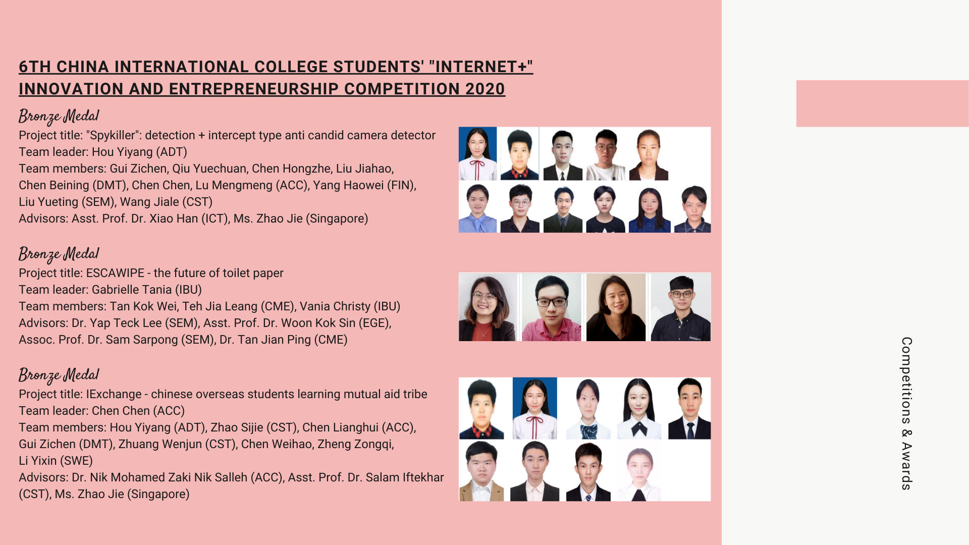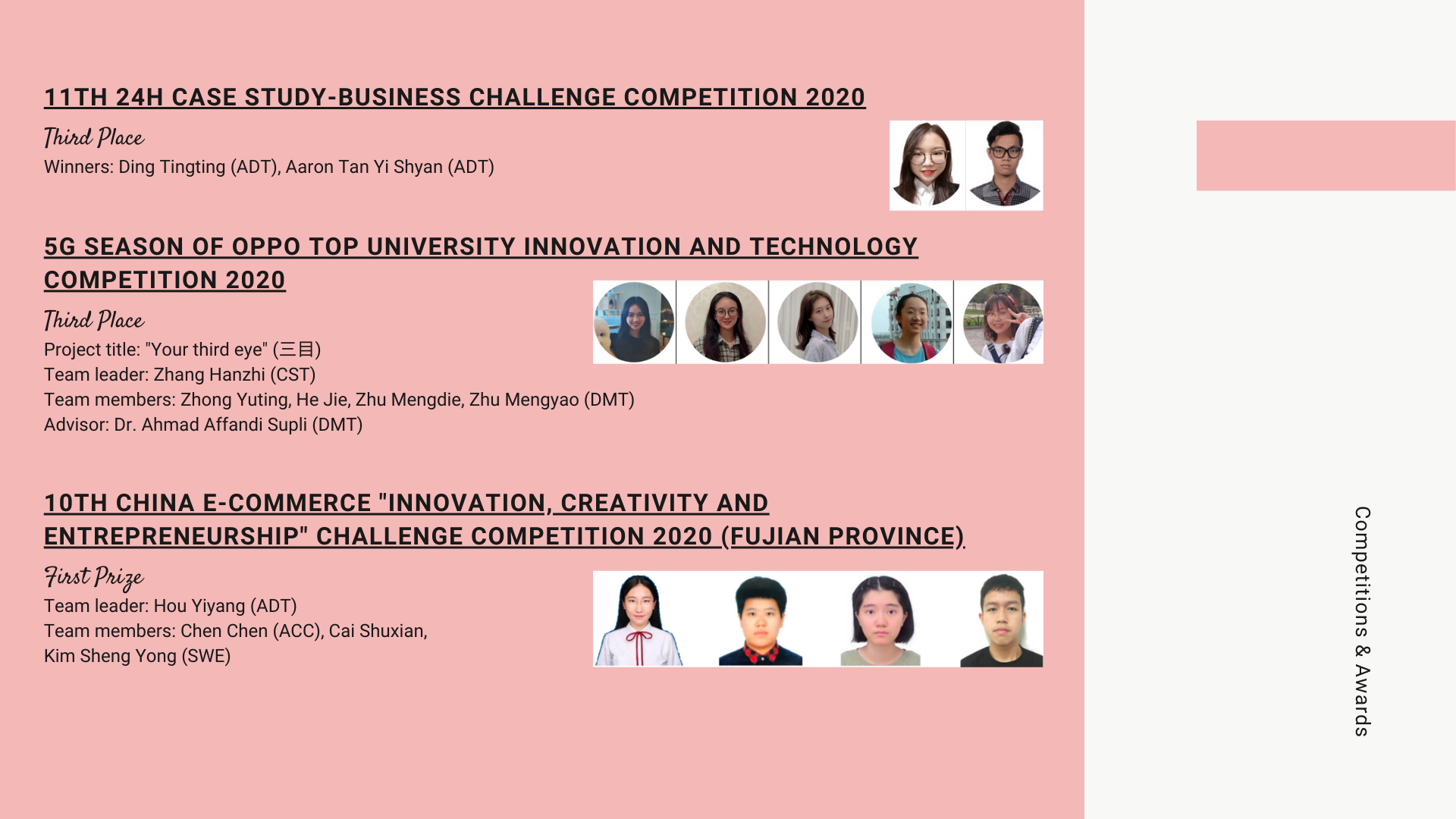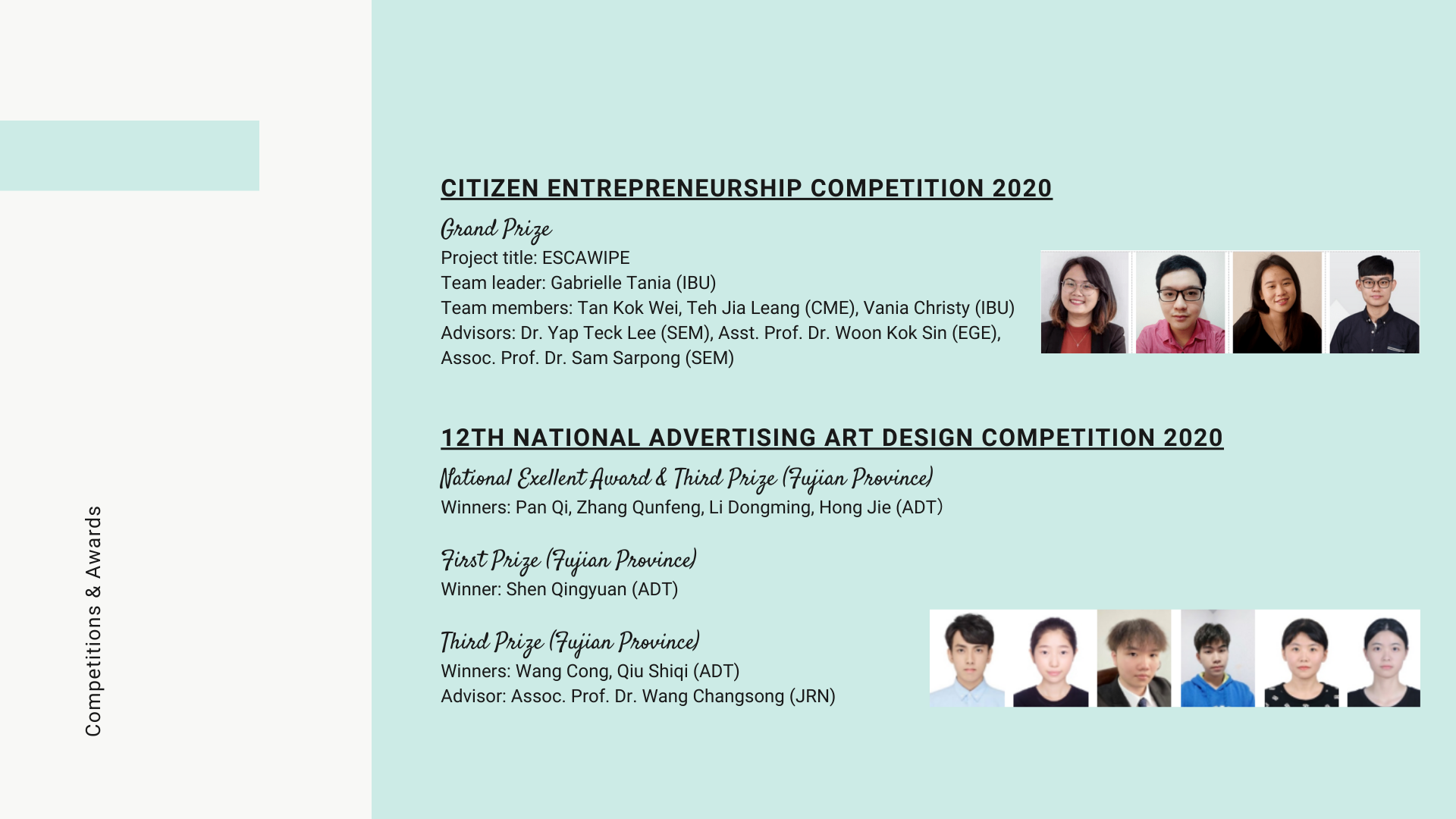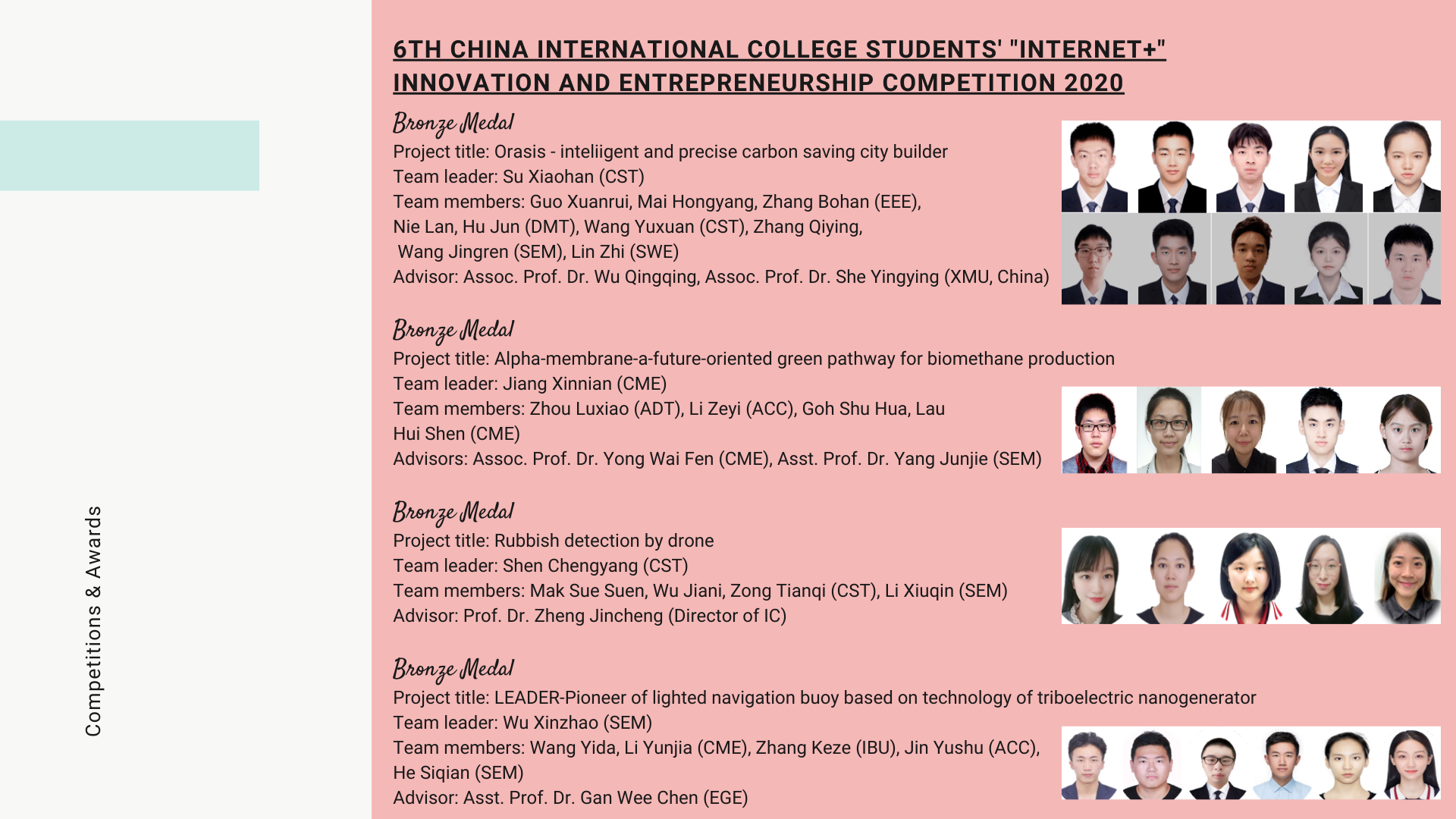 As innovation and creativity are fundamental to all academic disciplines and educational activities, Xiamen University Malaysia (XMUM) encourages students to participate in competitions and values their creative and innovative contributions. Since 2016, XMUM students have participated in more than 20 local, regional and international competitions, and have taken home over 55 prizes and awards marking individual and team success.