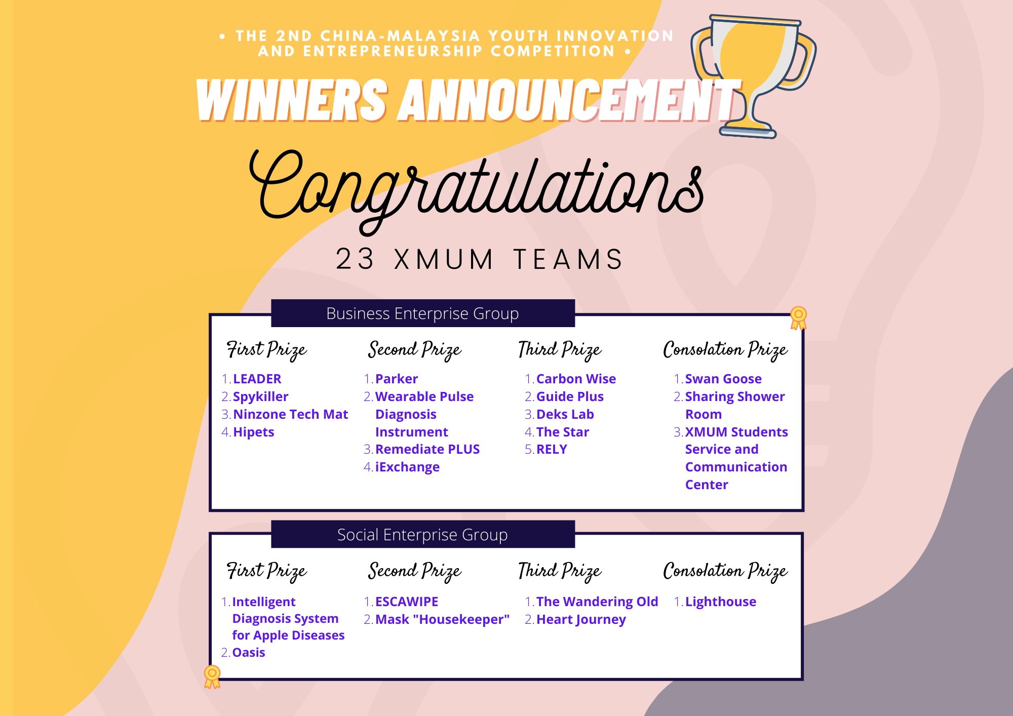 The Innovation Center congratulates 23 XMUM teams for bringing home 6 First Prizes, 6 Second Prizes, 7 Third Prizes and 4 Consolation Prizes from the 2nd China-Malaysia Youth Innovation and Entrepreneurship Competition, with a total cash prize of RM9,900.