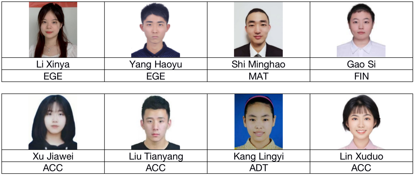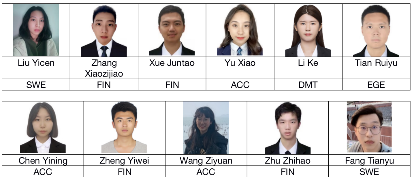 Team members: Zhang Xiaozijiao (FIN), Xue Juntao (FIN), Yu Xiao (ACC), Li Ke (DMT), Tian Ruiyu (EGE), Chen Yining (ACC), Zheng Yiwei (FIN), Wang Ziyuan (ACC), Zhu Zhihao (FIN), Fang Tianyu (SWE)