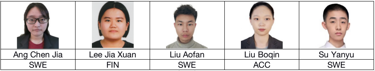 Team members: Lee Jia Xuan (FIN), Liu Aofan (SWE), Liu Boqin (ACC), Su Yanyu (SWE)