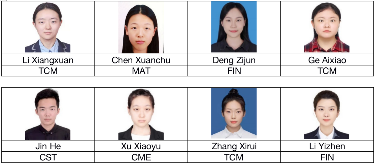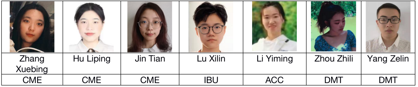 Team members: Chen Xuanchu (MAT), Deng Zijun (FIN), Ge Aixiao (TCM), Jin He (CST), Xu Xiaoyu (CME), Zhang Xirui (TCM), Li Yizhen (FIN)