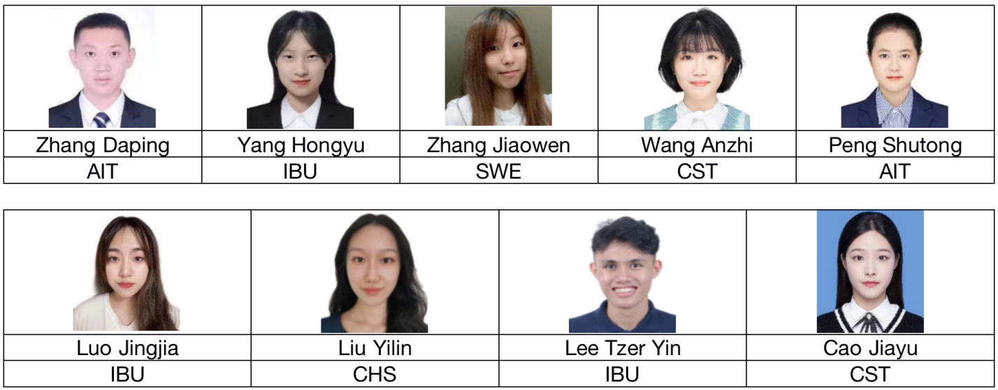 Team members: Yang Hongyu (IBU), Zhang Jiaowen (SWE), Wang Anzhi (CST), Peng Shutong (AIT), Luo Jingjia (IBU), Liu Yilin (CHS), Lee Tzer Yin (IBU), Cao Jiayu (CST)