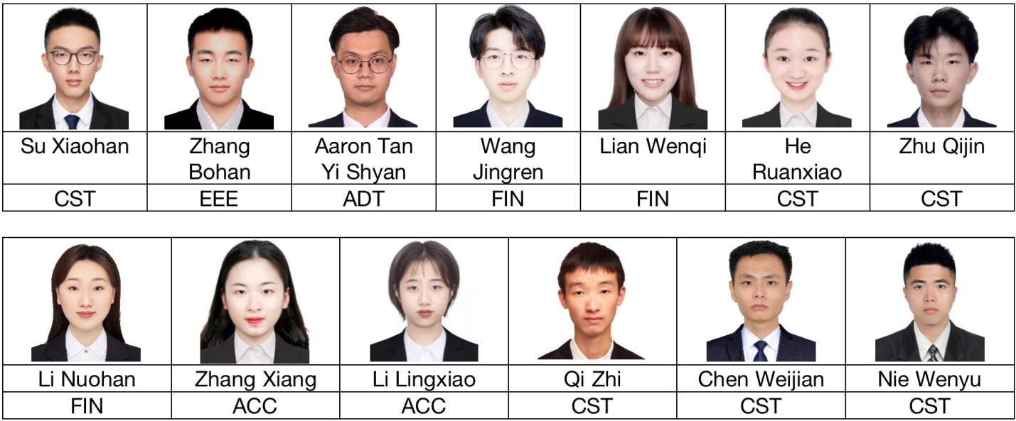 Team members: Zhang Bohan (EEE), Aarong Tan Yi Shyan (ADT), Wang Jingren (FIN), Lian Wenqi (FIN), He Ruanxiao (CST), Zhu Qijin (CST), Li Nuohan (FIN), Zhang Xiang (ACC), Li Lingxiao (ACC), Qi Zhi (CST), Chen Wenjian (CST), Nie Wenyu (CST)