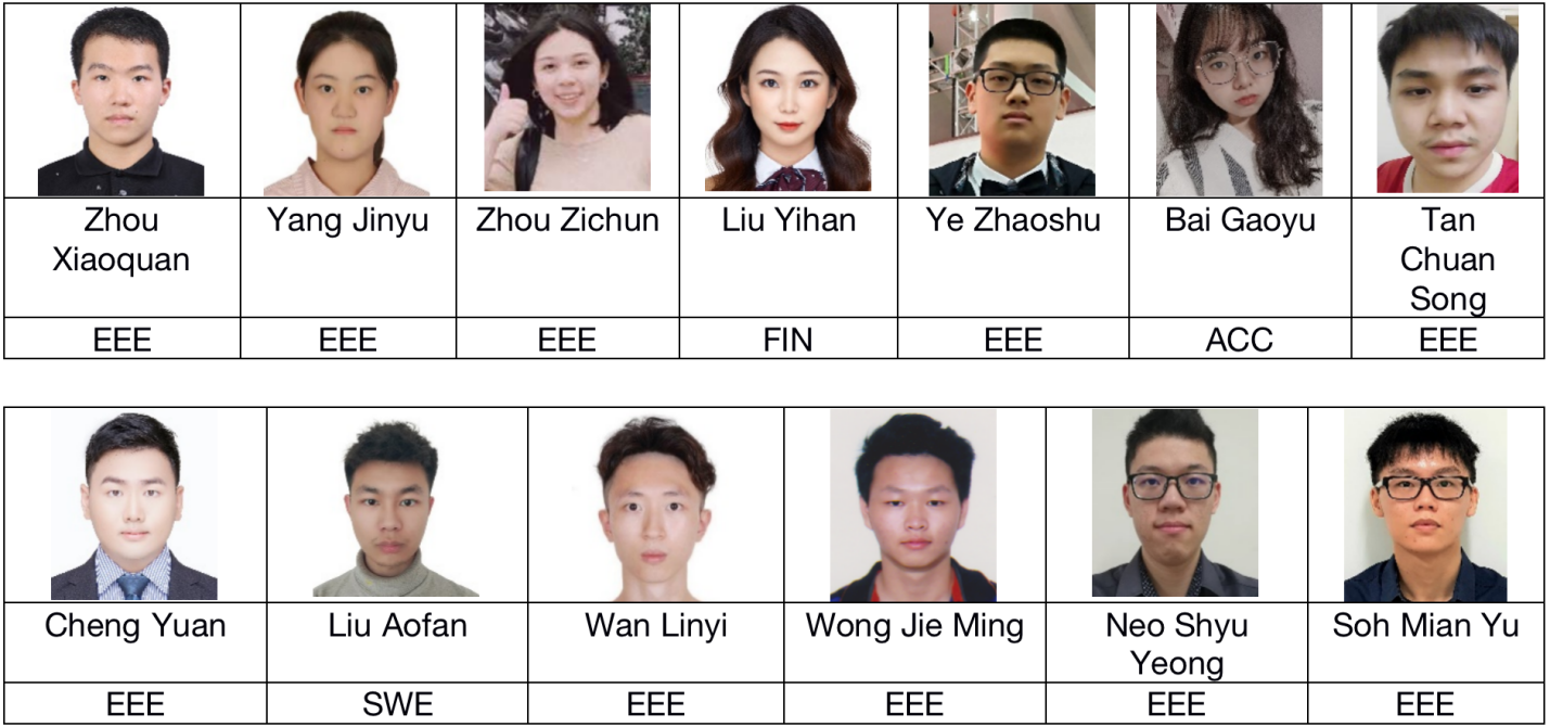 Team members: Yang Jinyu (EEE), Zhou Zichun (EEE), Liu Yihan (FIN), Ye Zhaoshu (EEE), Bai Gaoyu (ACC), Tan Chuan Song (EEE), Cheng Yuan (EEE), Liu Aofan (SWE), Wan Linyi (EEE), Wong Jie Ming (EEE), Neo Shyh Yeong (EEE), Soh Mian Yu (EEE)