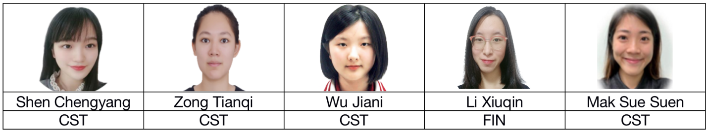 Team members: Mak Sue Suen (CST), Li Xiuqin (FIN), Wu Jiani (CST), Zong Tianqi (CST)