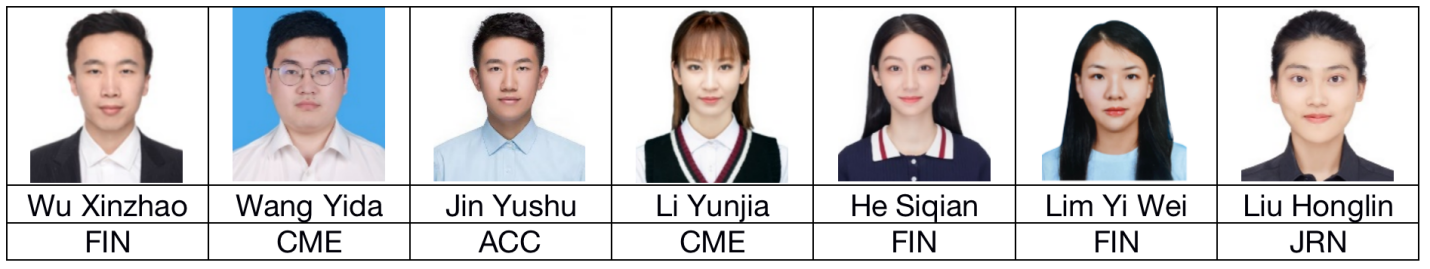 Team members: Wang Yida (CME), Jin Yushu (ACC), Li Yunjia (CME), He Siqian (FIN), Lim Yi Wei (FIN), Liu Honglin (JRN)