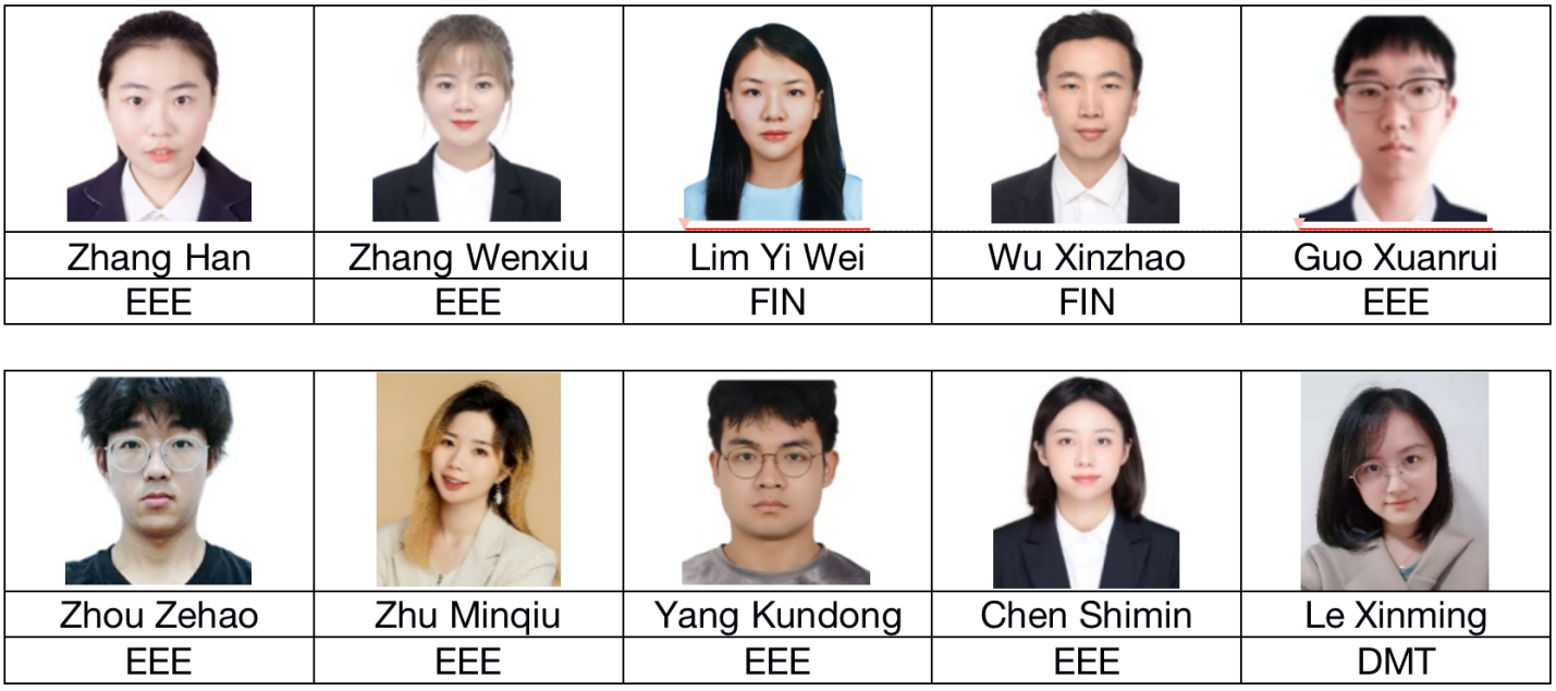 Team members: Zhang Wenxiu (EEE), Lim Yiwei (FIN), Wu Xinzhao (FIN), Guo Xuanrui (EEE), Zhou Zehao (EEE), Zhu Mingqiu (EEE), Yang Kundong (EEE), Chen Shimin (EEE), Le Xinming (DMT)