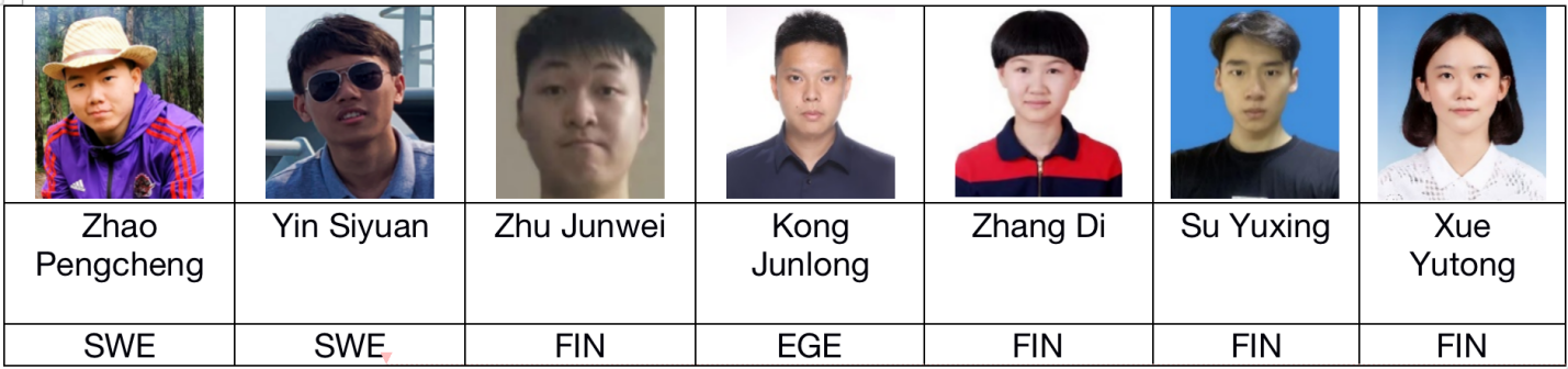 Team members: Yin Siyuan (SWE), Zhu Junwei (FIN), Kong Junlong (EGE), Zhang Di (FIN), Su Yuxing (FIN), Xue Yutong (FIN)