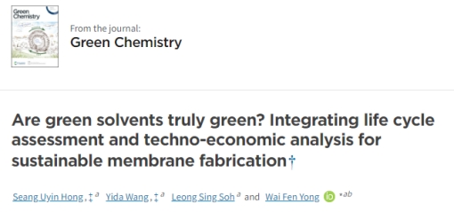 Entitled “Are green solvents truly green? Integrating life cycle assessment and techno-economic analysis for sustainable membrane fabrication”, this study aimed to appraise both environmental and economic perspectives of green solvents in fabricating polyimide flat sheet membranes. This analysis systematically evaluated from monomers to polymer synthesis and subsequently the design of scalable and sustainable membrane production processes. Noticeable impact decrements were spotted by replacing the toxic conventional solvent with a green solvent in membrane fabrication, but a green solvent might be less competitive in terms of production costs. Collectively, this integrated assessment was envisaged to elucidate environmental hotspots and process limitations that are pivotal for future engineering and research endeavors in polyimide membrane fabrication.