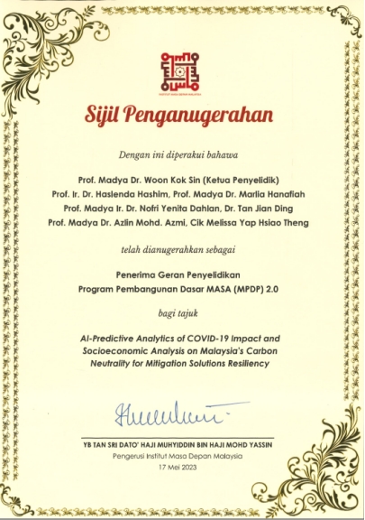 Assoc. Prof. Ts. Dr. Vincent Woon Kok Sin from the School of Energy and Chemical Engineering has received an MASA Policy Development Programme (MPDP 2.0) research grant of RM 10,000, for his research on COVID-19’s impact on Malaysia’s carbon neutrality.