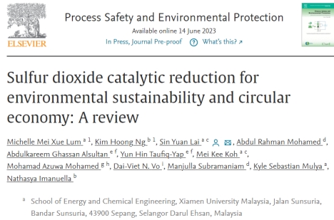 The Research and Postgraduate Centre congratulates Michelle Lum Mei Xue, Asst. Prof. Dr. Lai Sin Yuan, Dr. Koh Mei Kee, and Kyle Sebastian Mulya from the School of Energy and Chemical Engineering for publishing an article entitled Sulfur dioxide catalytic reduction for environmental sustainability and circular economy: A review in an SCI Q1 journal, Process Safety and Environmental Protection, with the latest impact factor of 7.926.