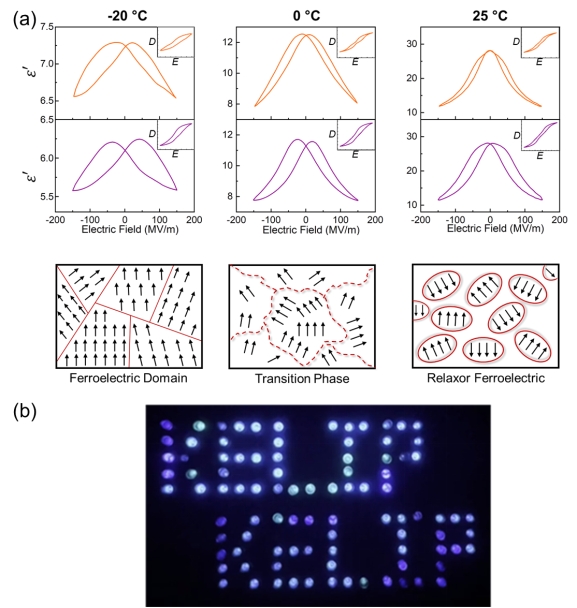 (piezoelectric dominant). Included are the proposed ferroelectric domains at these temperatures. (b) 94 LEDs arranged in “KELIP KELIP” lit up by the PVDF-TrFE-CTFE TENG.