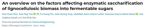 The Research and Postgraduate Centre congratulates Woo Wen Xuan, Asst. Prof. Dr. Tan Jian Ping, from the School of Energy and Chemical Engineering for publishing an article “An overview on the factors affecting enzymatic saccharification of lignocellulosic biomass into fermentable sugars” in Reviews in Chemical Engineering, a SCI Q1 journal with an impact factor of 8.742.