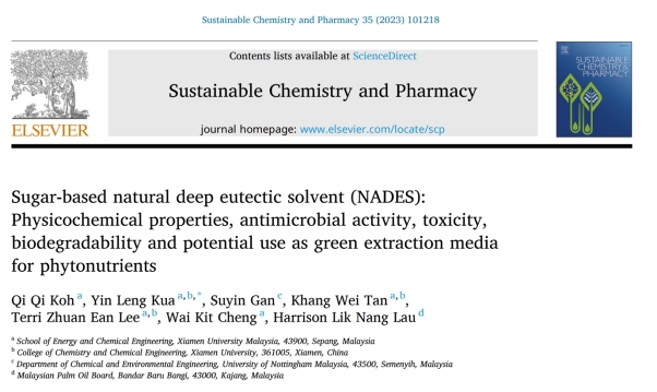 The Research and Postgraduate Centre congratulates Koh Qi Qi, Asst. Prof. Dr. Kua Yin Leng, Assoc. Prof. Dr. Tan Khang Wei, Dr. Terri Lee Zhuan Ean and Cheng Wai Kit from the Department of New Energy Science and Engineering (NESE), School of Energy and Chemical Engineering for their recent publication in Sustainable Chemistry and Pharmacy, a Q1 journal with a latest impact factor of 6.000.