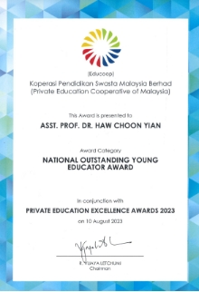 Held on 10 August 2023 at Mandarin Oriental Hotel, Kuala Lumpur, this annual event was organized for the 8th time by Private Education Cooperative of Malaysia (Educoop). It aims to recognize outstanding private educators from all private institutions in Malaysia under the categories of teaching, science, arts and design, engineering, research and innovation, and humanities.