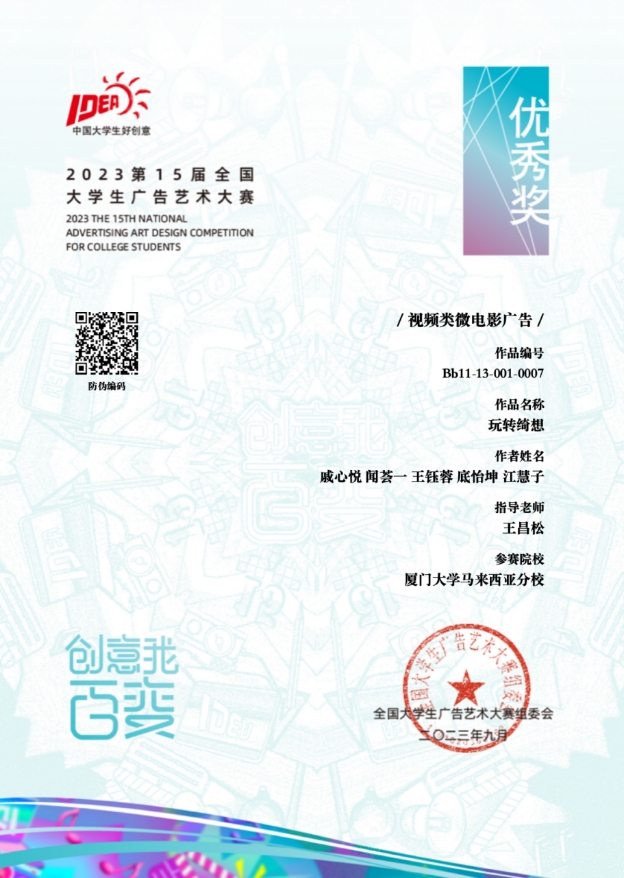 Among them, a team of five - Qi Xinyue, Wen Huiyi, Wang Yurong, Di Yikun and Jiang Huizi - earned the National Excellent Prize award for their idea “Fantasy Play”. The team is advised by Assoc. Prof. Dr. Wang Changsong, the Head of Department of Journalism and Advertising.