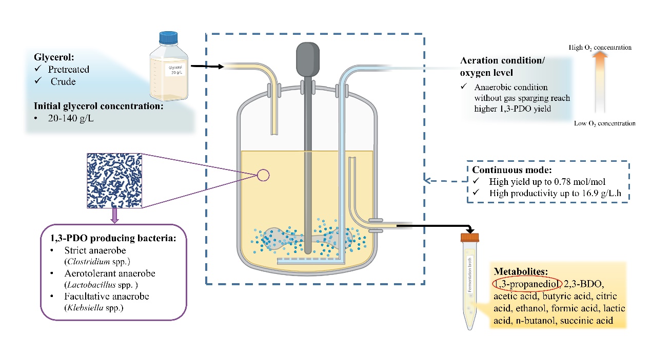 This review article highlights the key factors affecting on large-scale bioproduction of 1,3-propanediol (1,3- PDO) including fermentation modes, aeration conditions, substrate tolerance ability, and extent of metabolite inhibition by different bacterial strains. Biotransformation of glycerol using natural microorganisms has been identified as an efficient and environmentally friendly technique to produce 1,3-PDO which in line with Sustainable Development Goal 11: Sustainable Cities and Communities where a circular bioeconomy around palm oil and biodiesel industries can be established.This review serves as an all-rounded review on the recent advances of bio-based 1,3-PDO produced from pure culture glycerol fermentation.
