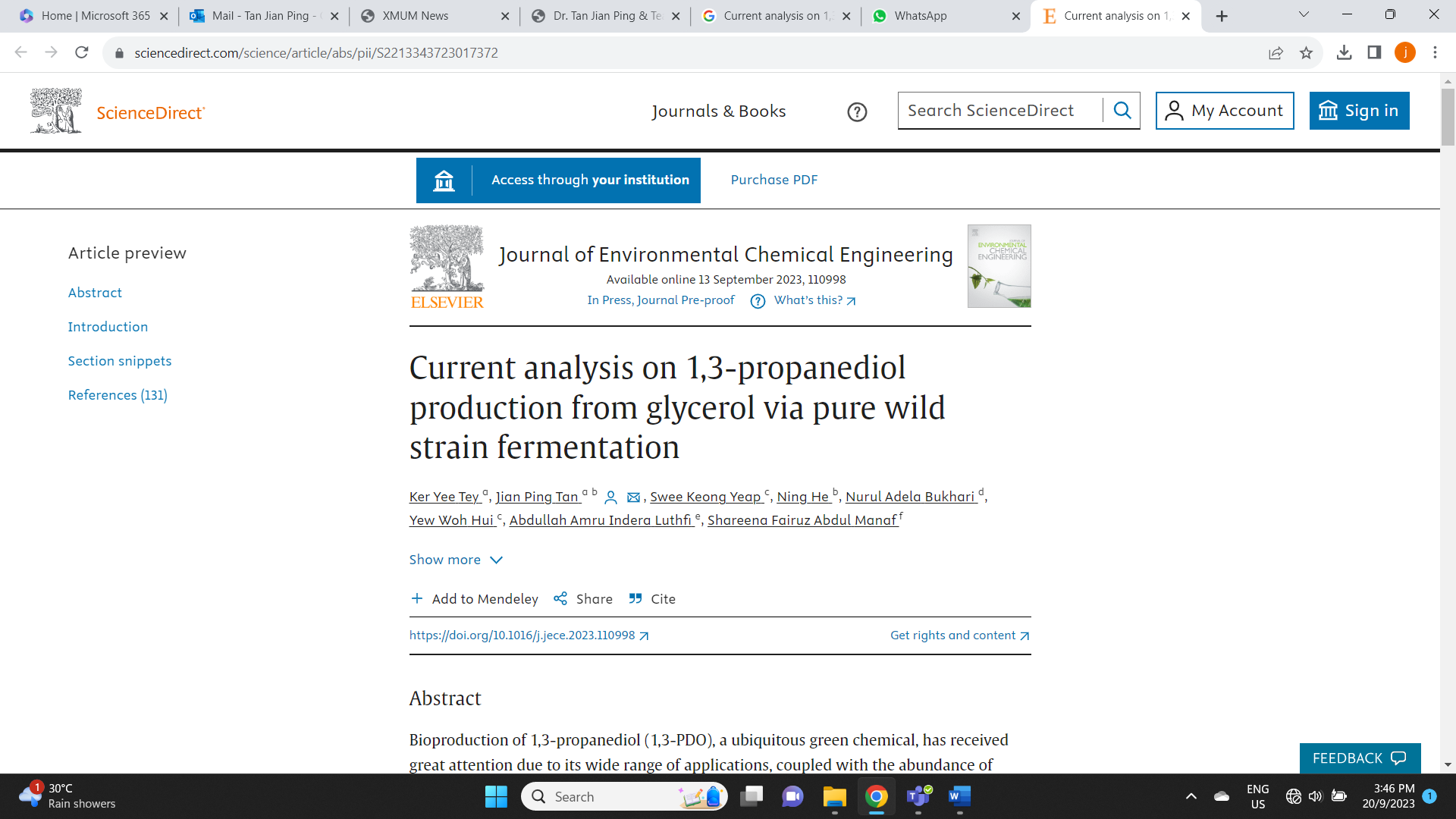 The Research and Postgraduate Centre congratulates Tey Ker Yee and Asst. Prof. Dr. Tan Jian Ping from the School of Energy and Chemical Engineering for publishing an article “Current analysis on 1,3-propanediol production from glycerol via pure wild strain fermentation” in Journal of Environmental Chemical Engineering, a SCI Q1 journal with an impact factor of 7.7.