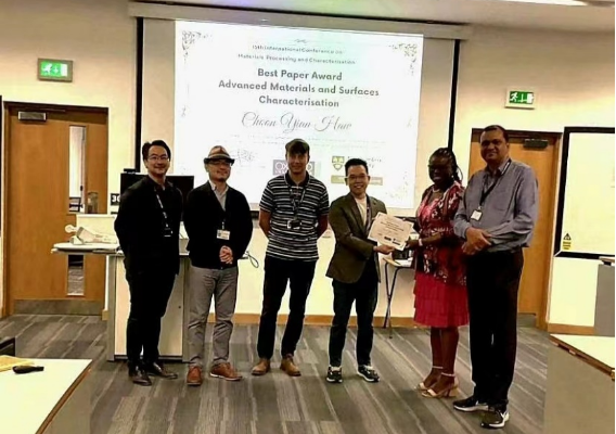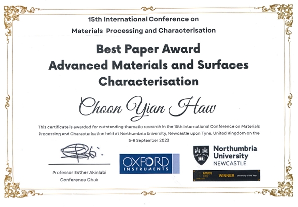 The Research and Postgraduate Centre congratulates Ts. Asst. Prof. Dr. Haw Choon Yian from the School of Energy and Chemical Engineering for being awarded the Best Paper Award (Advanced Materials and Surfaces Characterisation) at the 15th International Conference on Materials Processing and Characterization (ICMPC) held at Northumbria University, Newcastle-upon-Tyne, United Kingdom from 5 to 9 September 2023.