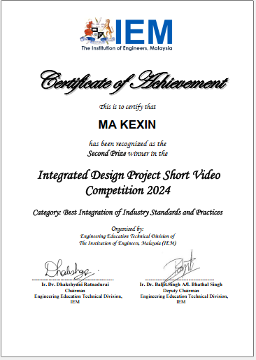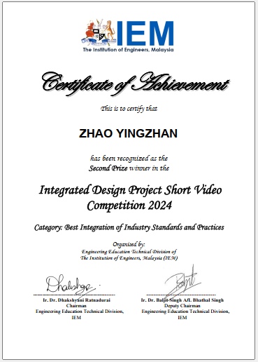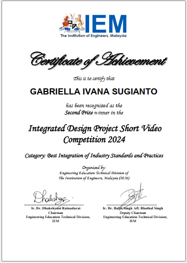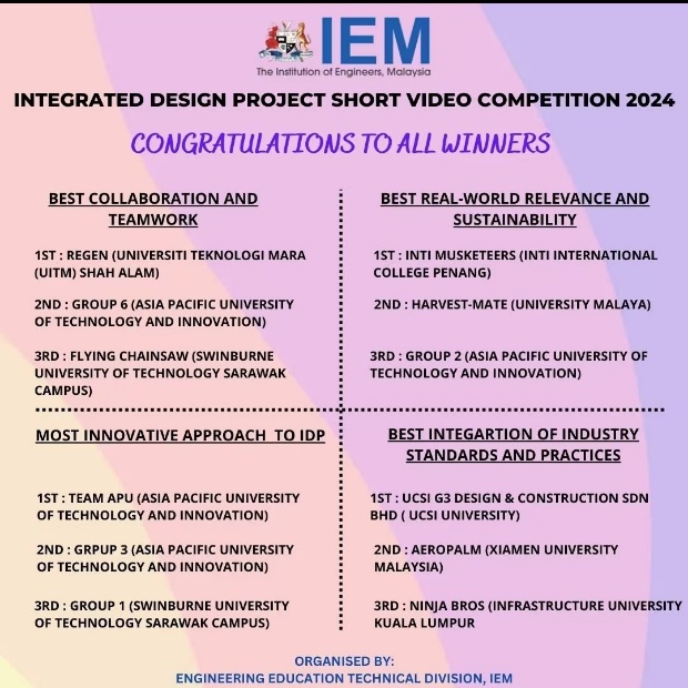 This competition was organized by the Engineering Education Technical Division (E2TD), the Institution of Engineers, Malaysia (IEM). It encourages all Malaysian Engineering and Engineering Technology undergraduate students to submit a 5-minute pitch presentation based on completed Capstone or Integrated Design Project from 2024, in the 4 categories of “Best Collaboration and Teamwork”, “Best Real-World Relevance and Sustainability”, “Most Innovative Approach to IDP”, “Best Integration of Industry Standards and Practices”. The submitted 5-minute pitch presentation was viewed and judged by experienced capstone / project coordinators and industrial engineers.