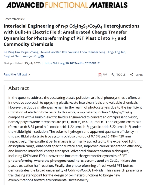 The research article, titled Interfacial Engineering of n-p Cd₂In₂S₅/Co₃O₄ Heterojunctions with Built-In Electric Field: Ameliorated Charge Transfer Dynamics for Photoreforming of PET Plastic into H₂ and Commodity Chemicals, presents a method to engineer a Cd₂In₂S₅/Co₃O₄ photocatalyst for simultaneous PET valorisation and hydrogen generation under ambient conditions, contributing to clean fuel production and environmental remediation.