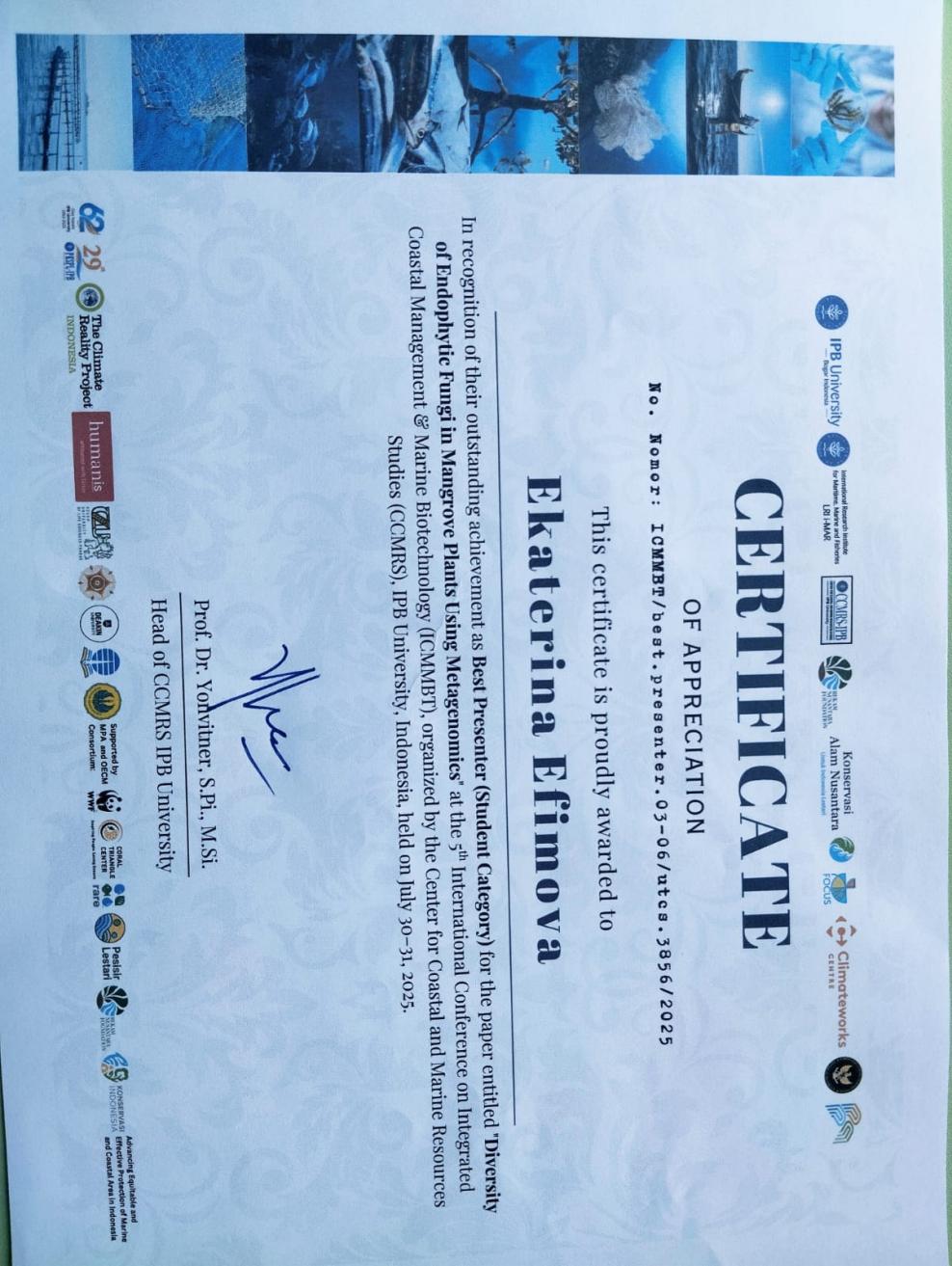 The Research and Postgraduate Centre congratulates Ekaterina Efimova (Kate) from the China-ASEAN College of Marine Sciences, Xiamen University Malaysia, for winning the Best Student Presenter Award at the 5th International Conference on Integrated Coastal Management & Marine Biotechnology (ICMMBT), held on 30 & 31 July 2025 in Yogyakarta, Indonesia.