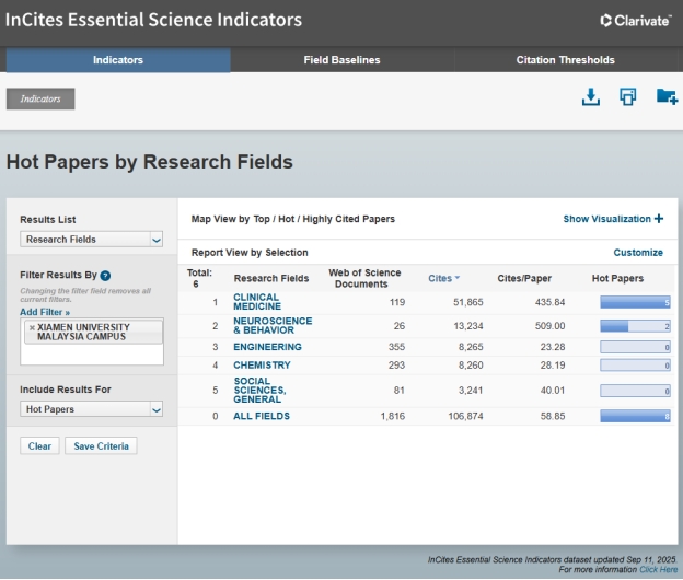 Meanwhile, 106 research papers published by XMUM scholars have been recognised as ESI Top papers, among which eight (8) papers were picked as Hot Papers, as shown in the ESI database updated in September 2025.