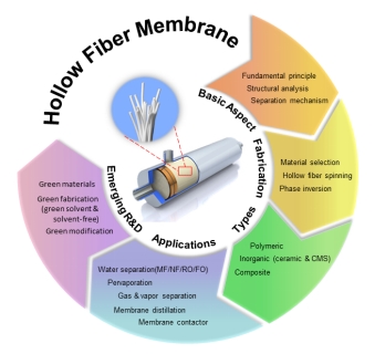 Entitled “State-of-the-Art Organic- and Inorganic-Based Hollow Fiber Membranes in Liquid and Gas Applications: Looking Back and Beyond”, this review systematically outlines the latest advances in organic, inorganic, and composite hollow fiber membranes. Their utilization in various liquid and gas applications - including microfiltration, nanofiltration, reverse osmosis, forward osmosis, pervaporation, gas and vapor separation, membrane distillation, and membrane contactor - is presented, while their applications in nuclear waste treatment and biomedical fields such as hemodialysis and drug delivery are emphasized. Moreover, the emerging R&D areas, particularly green fabrication and modification techniques as well as sustainable materials for hollow fiber membranes, are highlighted. As such, the comprehensive and critical insights gained in this review are anticipated to provide a new research doorway to stimulate the future development and optimization of hollow fiber membranes.
