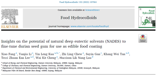 The title of the publication is “Insights on the potential of natural deep eutectic solvents (NADES) to fine-tune durian seed gum for use as edible food coating”. In this paper, related findings on the use of durian seed gum, NADES, and eutectogel as food coating are reviewed. Firstly, gum extracted from durian seeds is evaluated for the formulation of eutectogel food coating, which is tunable using NADES. Then, NADES and eutectogel are reviewed and discussed along with the possible solutions to encounter the potential challenges of eutectogel formulation for use as food coating. Possible choices of NADES are also identified and suitable computational tools for the selection of HBA and HBD in the formulation of NADES are reviewed with the objective of fine-tuning the properties of eutectogel produced from durian seed gum.