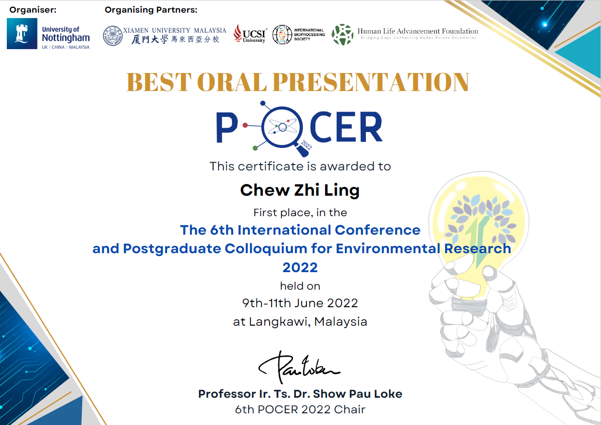 The Centre for Postgraduate Studies and Research congratulates Chew Zhi Ling, a master student from XMUM School of Energy and Chemical Engineering, on winning the 1st Place in Best Oral Presentation Award at the 6th International Conference & Postgraduate Colloquium for Environmental Research (POCER) 2022, which was held on 9-11 Jun 2022 at Langkawi, Malaysia.