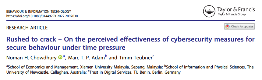 In the article entitled “Rushed to crack – On the perceived effectiveness of cybersecurity measures for secure behaviour under time pressure”, the authors report results from an online survey (N = 207), investigating how users perceive the effectiveness of CSMs for facilitating secure behaviour under time pressure. According to their research, the effectiveness perceptions differ greatly across CSMs, while the users’ appreciation of incident severity and the general level of time pressure in their daily lives emerge as important antecedents of these perceptions. Four distinct CSM groups (Severity, Time Poor, Enthusiast, Invariant) are identified where each group’s CSMs exhibit a unique set of antecedents of perceived effectiveness. Meanwhile, the authors provide additional insights into the user perspective in terms of why users deem a particular CSM as effective (or ineffective) for situations of time pressure. These insights into users’ perceptions, as well as their motives and reasoning, can guide researchers and practitioners in devising strategies, awareness programmes, and training materials to facilitate secure behaviour.