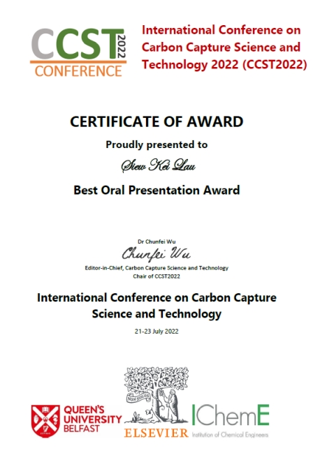 The Center for Postgraduate Studies and Research congratulates Lau Siew Kei, a master’s student in Chemical Engineering from XMUM School of Energy and Chemical Engineering for winning the Best Oral Presentation Award at the International Conference on Carbon Capture Science and Technology 2022 (CCST 2022), which was held virtually during 21-23 July 2022. Organized by Queen’s University Belfast, this conference aims to promote carbon capture research.