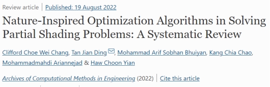 The paper entitled "Nature-Inspired Optimization Algorithms in Solving Partial Shading Problems: A Systematic Review" captures the applications of artificial intelligent techniques in solving partial shading problems of photovoltaic systems. It offers a comprehensive review of nature-inspired AI methodologies in the optimization of the power output of PV systems under dynamic and changing shading conditions. Unique enhancements and modifications pertaining to the developments of the AI schemes in solving similar problems are reviewed, while several research gaps are identified and reported to guide future studies in enhancing the algorithms.