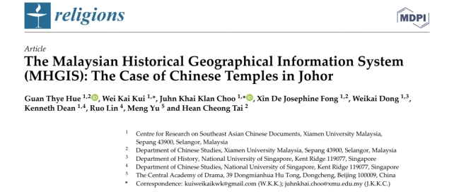 The Malaysian Historical Geographical Information System (MHGIS) is an attempt to map out the Chinese religion and beliefs in the region in order to achieve a deeper understanding of the history and cultural changes of the local Chinese community. Entitled The Malaysian Historical Geographical Information System (MHGIS): The Case of Chinese Temples in Johor, the article shows how the team used the existing data of more than 900 temples and the HGIS tools to demonstrate the development of Chinese religion in the Johor state, providing a new understanding and method of Chinese temples and beliefs through the study of underlying communities.