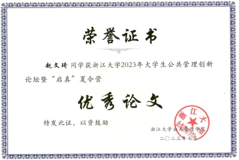 The Research and Postgraduate Centre congratulates Zhao Wenqi, an undergraduate from the Finance programme at the School of Economics and Management, Xiamen University Malaysia on winning the Outstanding Paper Award in the 2023 Undergraduate Public Management Innovation Forum and “Qizhen” (启真) Summer Camp held by Zhejiang University during 5-8 July, 2023.