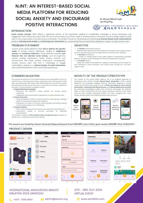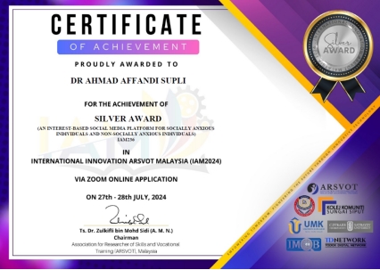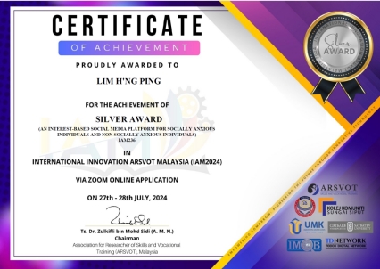 "Receiving the Silver Award at IAM2024 is a moment of great pride and accomplishment. It was both challenging and exciting to design a platform that incorporates personalized features to support users in overcoming social anxiety. This recognition motivates me to continue refining the platform and explore new ways to make social media a more inclusive and supportive space. I’m incredibly thankful for the guidance from my supervisor: Dr. Ahmad Affandi Supli and the feedback from users that helped shape this project."