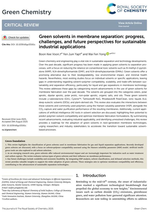 A critical review article by Prof. Ir. Dr. Yong Wai Fen, Master's student Voon Boon Kee, and undergraduate student Yap Yen Juin from the School of Energy and Chemical Engineering, Xiamen University Malaysia (XMUM), has been published in Green Chemistry, a peer-reviewed journal by the Royal Society of Chemistry (Impact Factor: 9.2, SCIE Q1). The work was carried out under the Centre of Excellence for Green and Advanced Technologies in Efficient Separations (GATES).