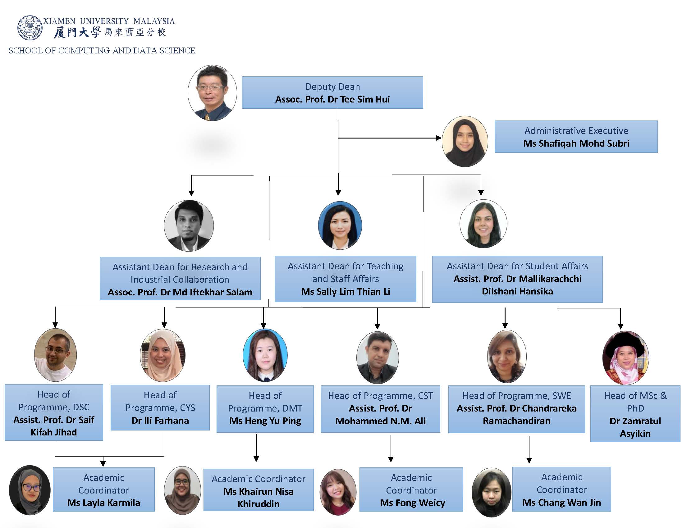 Submitted by admin on Wed, 07/09/2025 - 14:15 Organizational Chart Organisational Chart Staff ASSOC. PROF. DR. TEE SIM HUI Associate Professor, Deputy Dean ASSOC. PROF. DR. MD. IFTEKHAR SALAM Associate Professor, Assistant Dean for Research and Industrial Collaboration MS. LIM THIAN LI Senior Lecturer, Assistant Dean for Teaching and Staff Affairs ASST. PROF. DR. DILSHANI HANSIKA MALLIKARACHCHI Assistant Professor, Assistant Dean for Student Affairs ASST. PROF. DR. SAIF KIFAH JIHAD Assistant Professor, Head of Programme (DSC) DR. ILI FARHANA BINTI MD MAHTAR Senior Lecturer, Head of Programme (CYS) MS. HENG YU PING Senior Lecturer, Head of Programme (DMT), SCDS Student Council Advisor ASST PROF. DR. MOHAMMED N.M. ALI Assistant Professor, Head of Programme (CST) ASST. PROF. DR. CHANDRA REKA RAMACHANDIRAN Assistant Professor, Head of Programme (SWE) Ts. DR. ZAMRATUL ASYIKIN BINTI AMRAN Senior Lecturer, Head of Programme (Postgraduate) ASST. PROF. TS. DR. WONG LAI WAN Registrar MR. VENANTIUS KUMAR SEVAMALAI Lecturer DR. AHMAD AFFANDI SUPLI Senior Lecturer DR. AZMI BIN MOHD YUSOF Senior Lecturer MR. WONG CHIM CHWEE Senior Lecturer MS. SUBASHINI RAGHAVAN Lecturer MS. NURUL AMERA MUHAMAD NAZMI Lecturer DR. NOOR HIDA NATRAH BINTI AZIZ Lecturer MS. NOOR HAFIZAH ISMAIL Senior Lecturer MR. MOHD SHAZMIR BIN SHAHARUDDIN Lecturer DR. SUBASHINI GANAPATHY Lecturer MS. NOORAZIERA AKMAL BINTI SUKOR Lecturer MS. THARSINIY RAMASAMY Lecturer ASST. PROF. DR. LUTFUN NAHAR Assistant Professor DR. LEE SUI PING Lecturer DR. HIEW FUI CHIN Senior Lecturer MR. ANIS ALAGANDRA KARPAYAH Lecturer ASST. PROF. Ts. DR. TEH JIA YEW Assistant Professor ASSOC. PROF. Ts. DR. YAU WEI CHUEN Associate Professor DR. SARAS KRISHNAN Senior Lecturer MR. MUHAMMAD SUFYAN BIN QARI ABDUL SHAKOOR Lecturer ASSOC. PROF. DR. MAHDI H. MIRAZ Associate Professor MS. HAFIZAH BTE A RAZAK Lecturer DR. BURRA VENKATA DURGA KUMAR Senior Lecturer ASST. PROF DR. YOONG KOOI KUAN Assistant Professor ASSOC. PROF. DR. WANG YIJU Associate Professor ASST. PROF. DR. SAMBASIVAM GNANASEKARAN Assistant Professor ASST. PROF. DR. NOWSHATH KADHAR BATCHA Assistant Professor DR. NAJLAA ATEEQ MOHAMMED DRAIB Lecturer ASST. PROF. DR. LI JING Assistant Professor DR. GEETHA KANAPARAN Senior Lecturer MR. DANIAL KAFI AHMAD Senior Lecturer ASST. PROF. DR. AL FAWAREH HEJAB MAAZER KHALED Assistant Professor ASST. PROF. DR. TOA CHEAN KHIM Assistant Professor Use Sliding Banner? Off Off