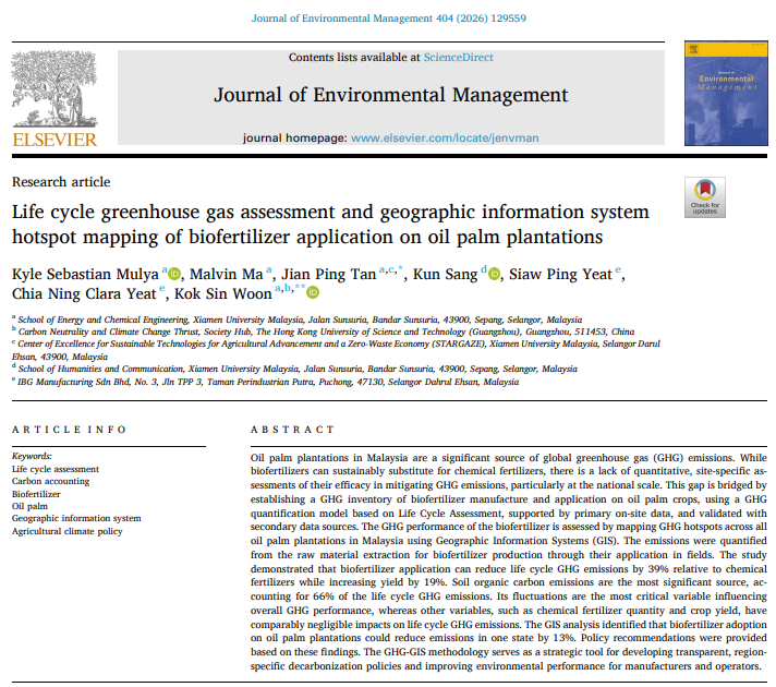 Kyle, a Master's student and Malvin, a PhD student, are the first and second authors of the paper, respectively. The article, titled “Life Cycle Greenhouse Gas Assessment and Geographic Information System Hotspot Mapping of Biofertilizer Application on Oil Palm Plantations”, presents an integrated framework combining Life Cycle Assessment (LCA) and Geographic Information System (GIS) modelling to evaluate greenhouse gas (GHG) emissions from fertilisation practices in oil palm cultivation.